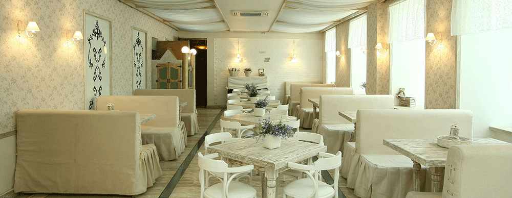 В качестве отделки дизайнеры часто прибегают к цветочным мотивам, интересным орнаментам. Стены украшаются текстильными панелями и шелкографией, если используются обои, то обязательно с имитацией цветочного узора, вытканного на полотне. Все это позволяет легко создать в заведении романтическую обстановку.